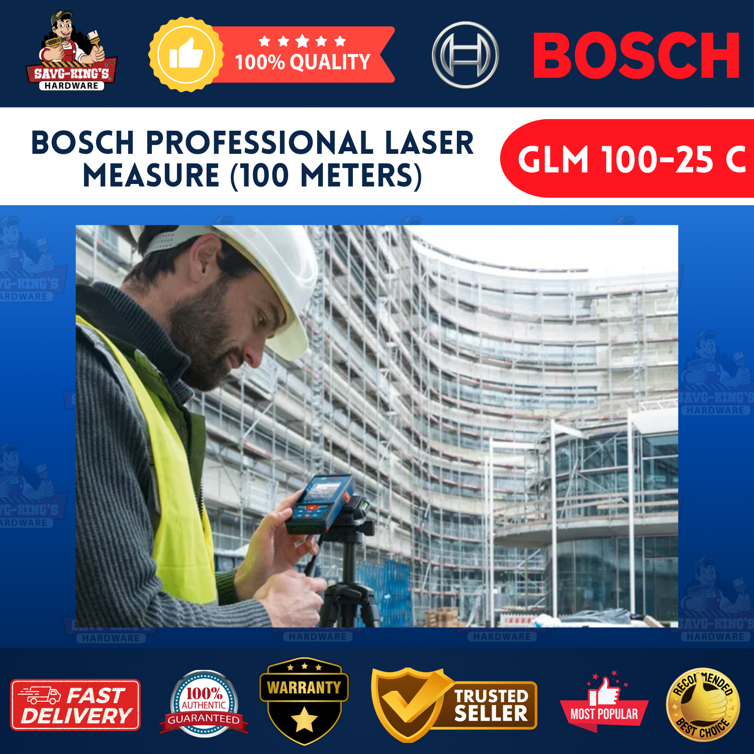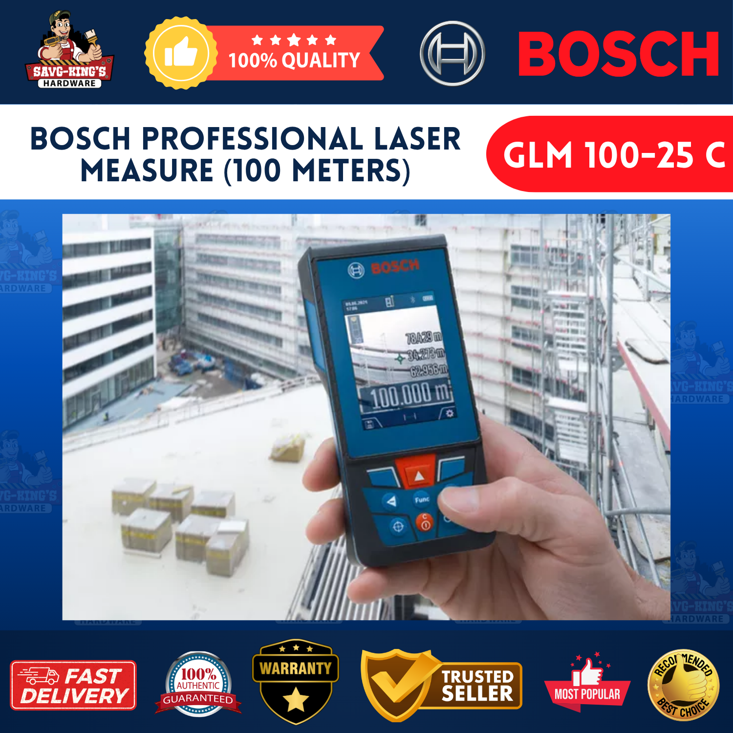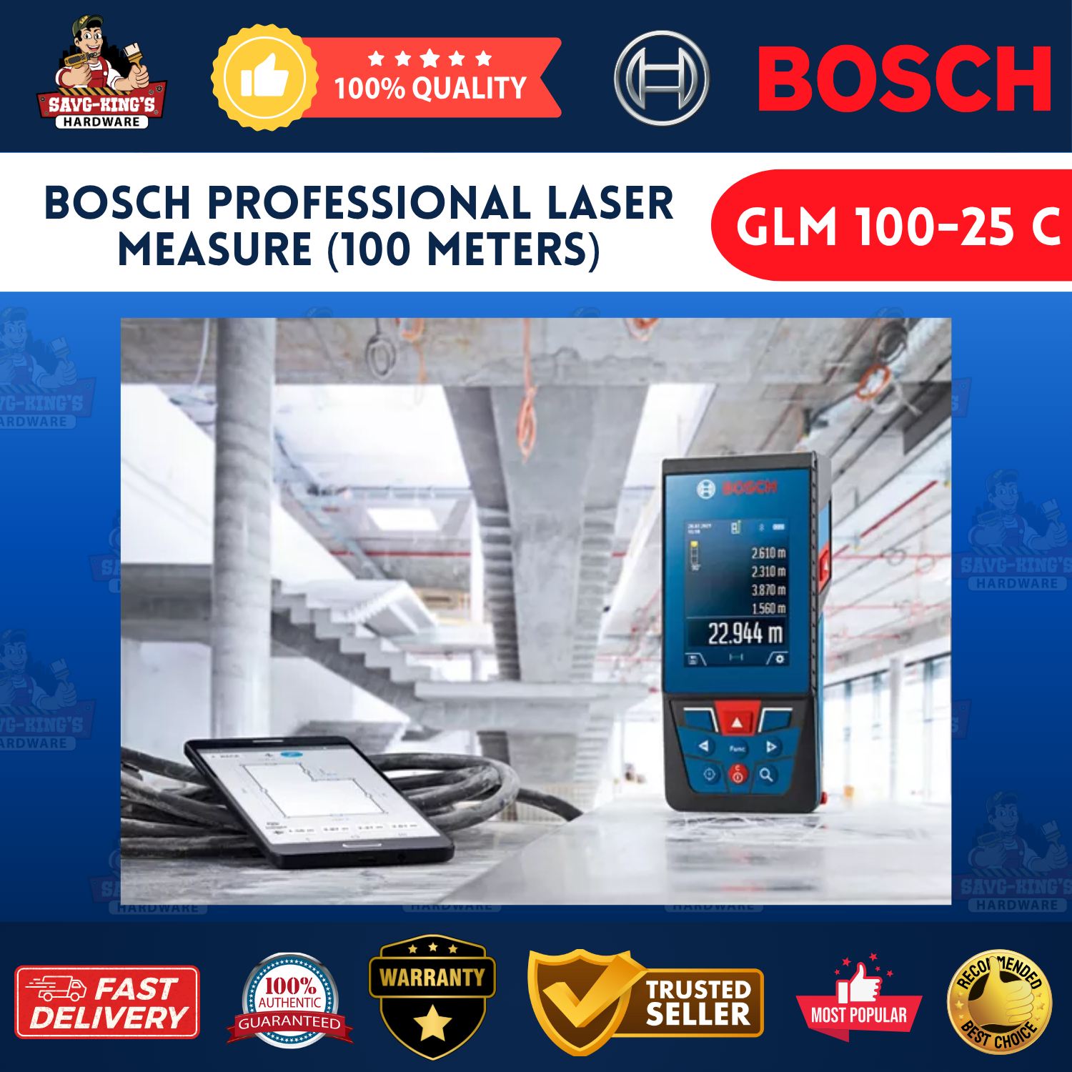 The Bosch GLM 100-25 C is a high-performance laser measure built for precision and efficiency. With a 100-meter working range, this tool supports multiple measurement functions, including area and volume, and features a camera viewfinder, tilt sensor, and Bluetooth connectivity for seamless data sharing—making it perfect for accurate measurements in various jobsite conditions.