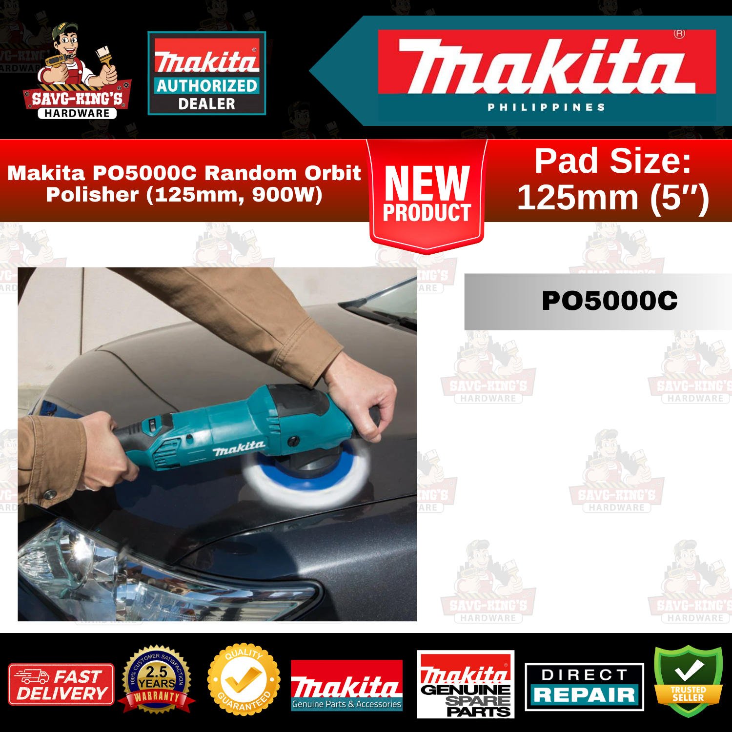 The Makita PO5000C Random Orbit Polisher (900W, 125mm pad) offers variable speed control, ergonomic design, and soft start for efficient polishing, compounding, waxing, and buffing with reduced vibration and improved maneuverability.