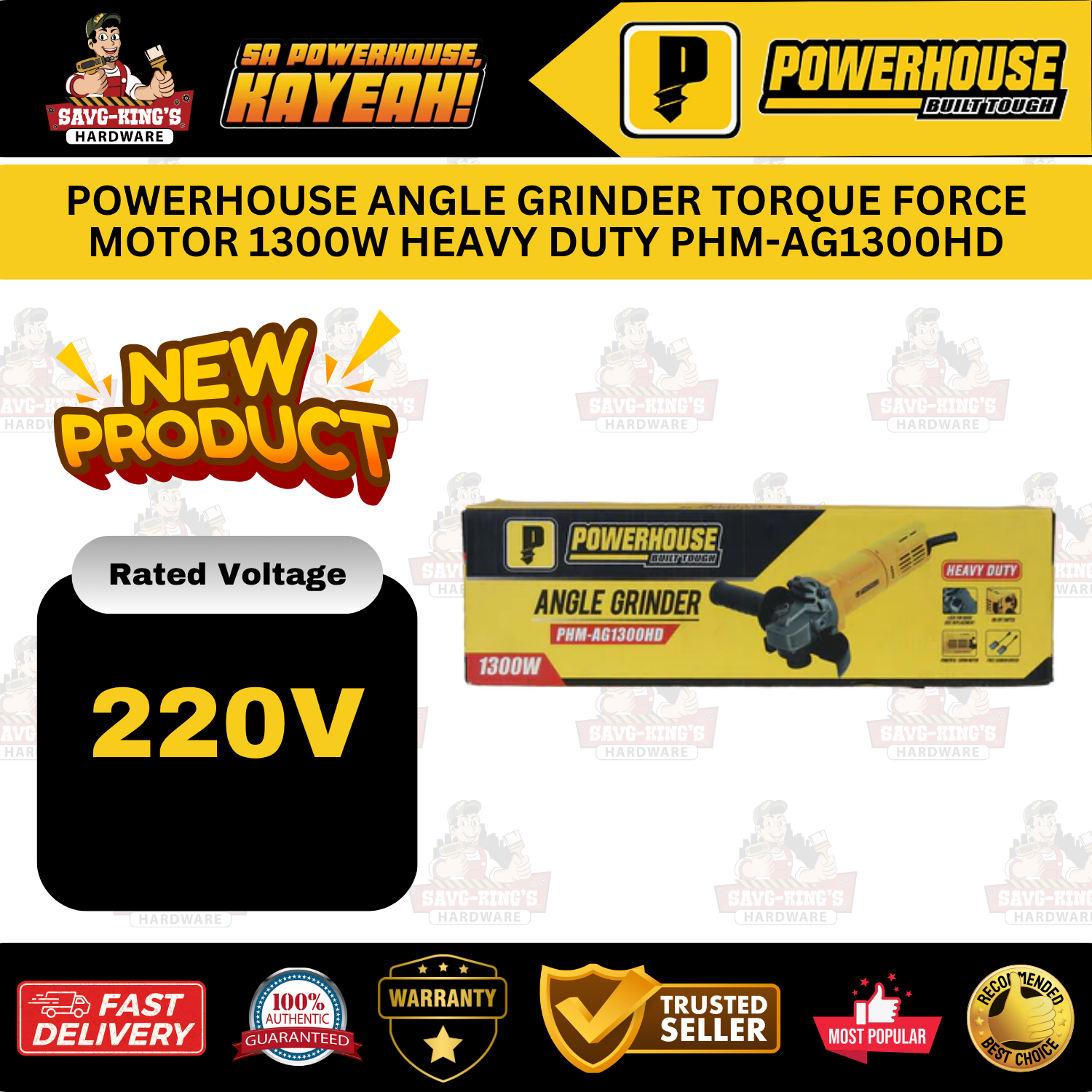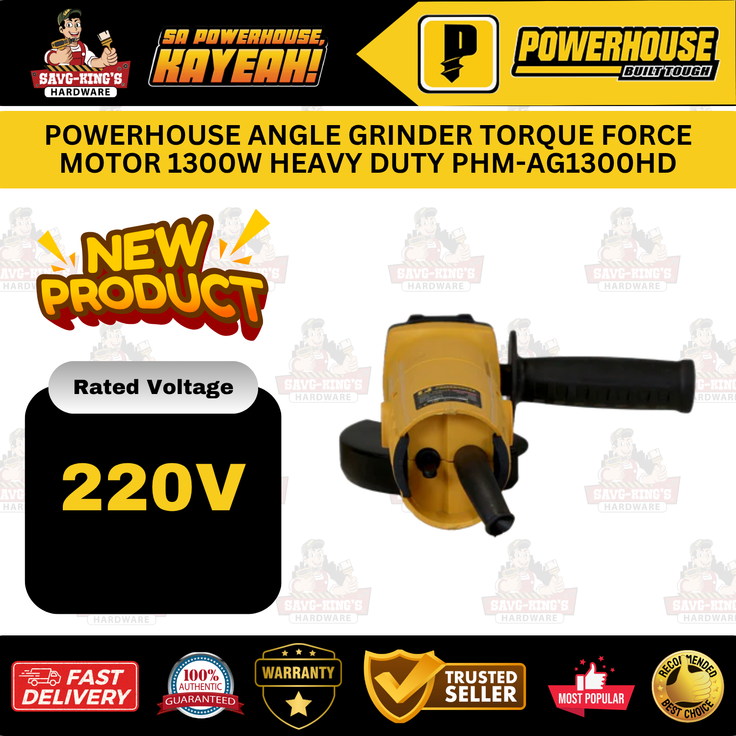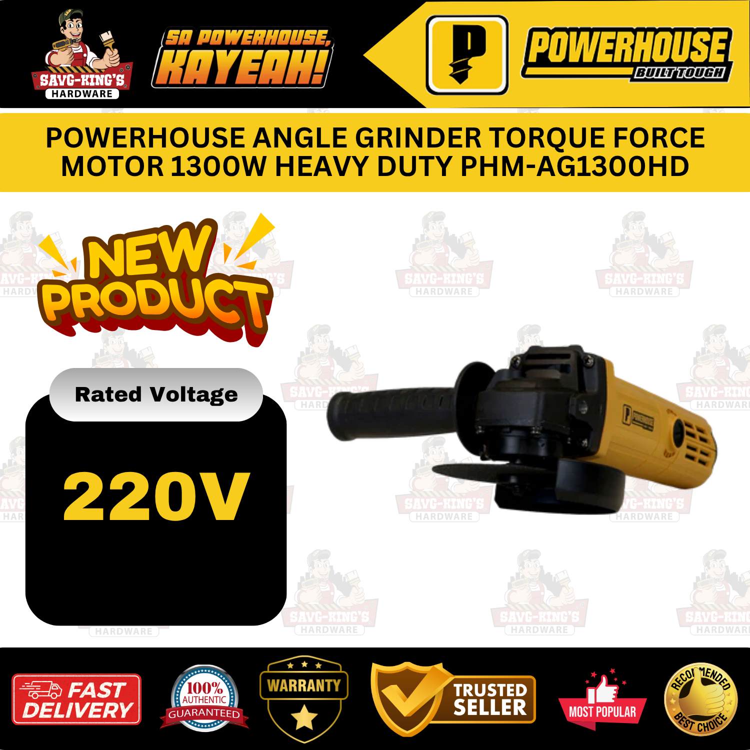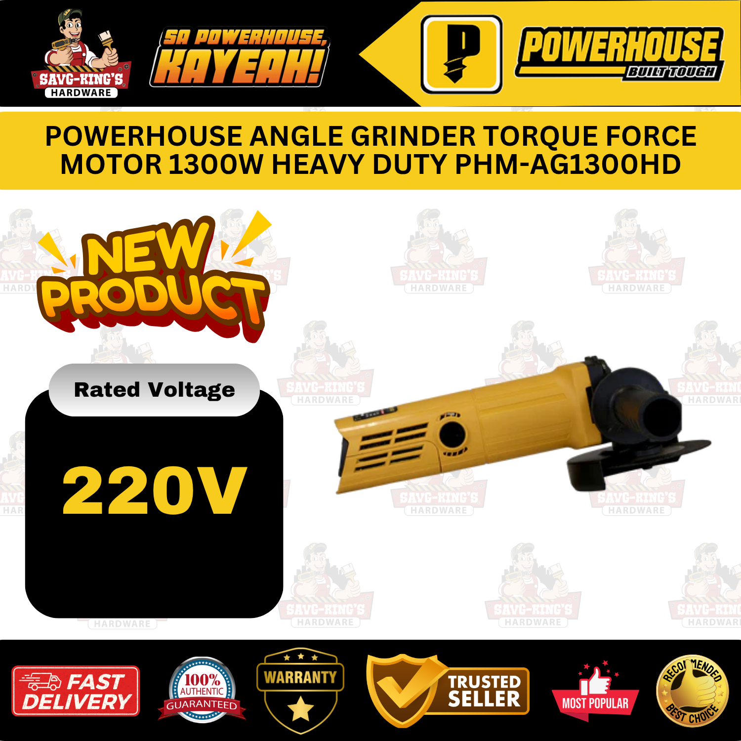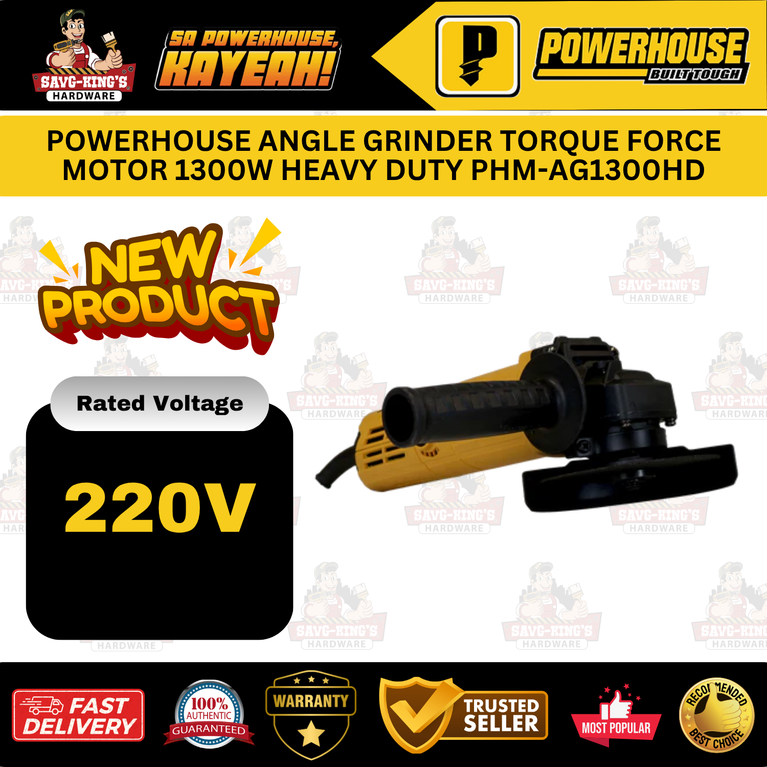 The POWERHOUSE Angle Grinder PHM-AG1300HD delivers 1300W of power and 1100RPM speed with a 100MM disc, built with a compact, ergonomic design and adjustable side handle for heavy-duty grinding tasks.