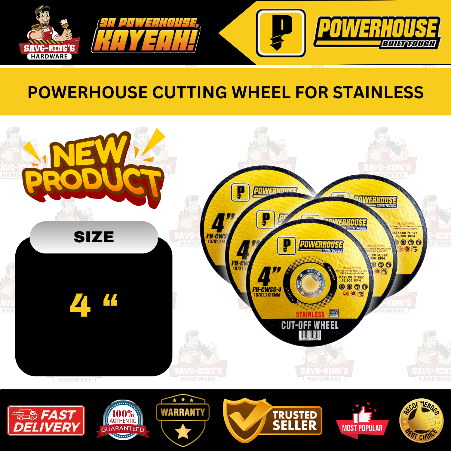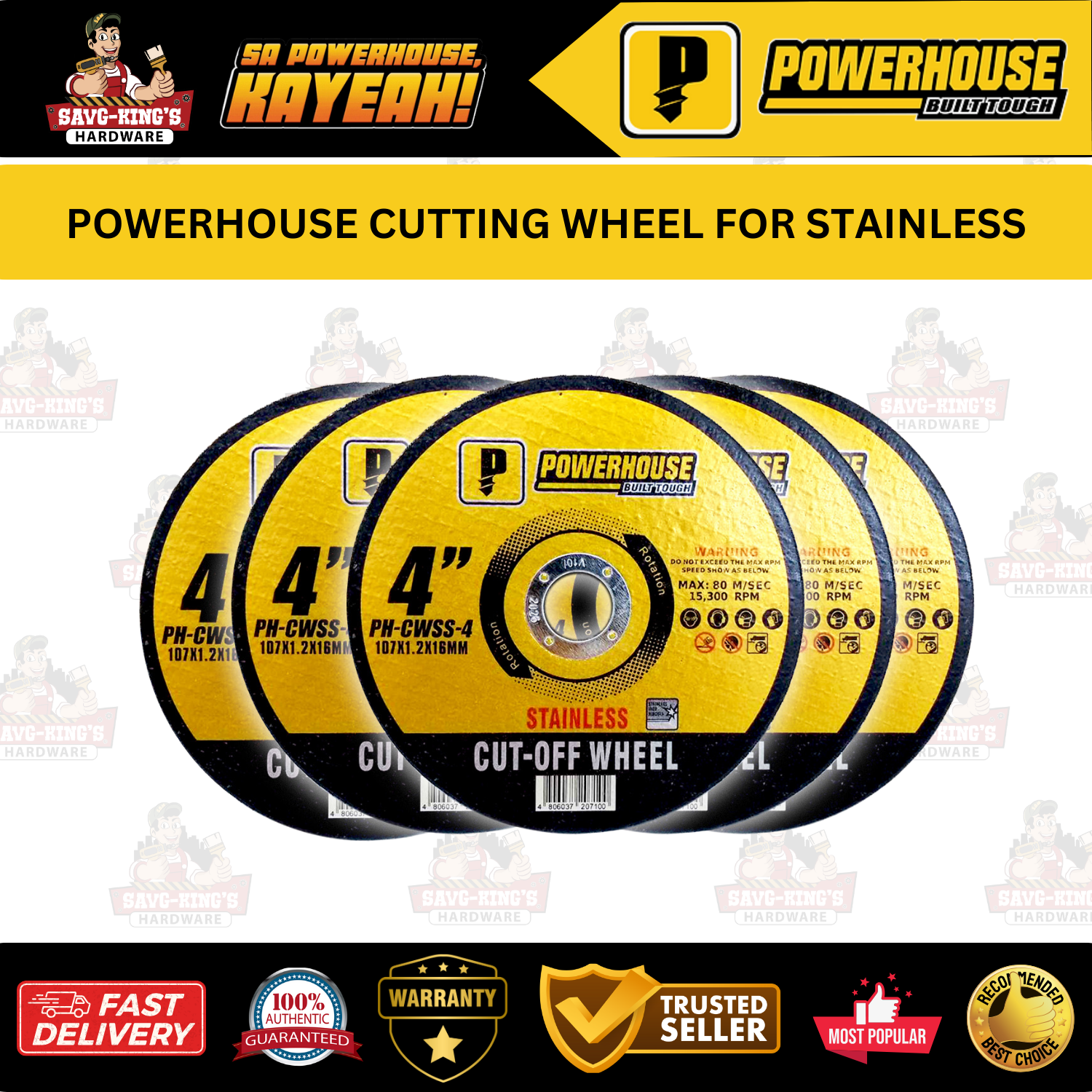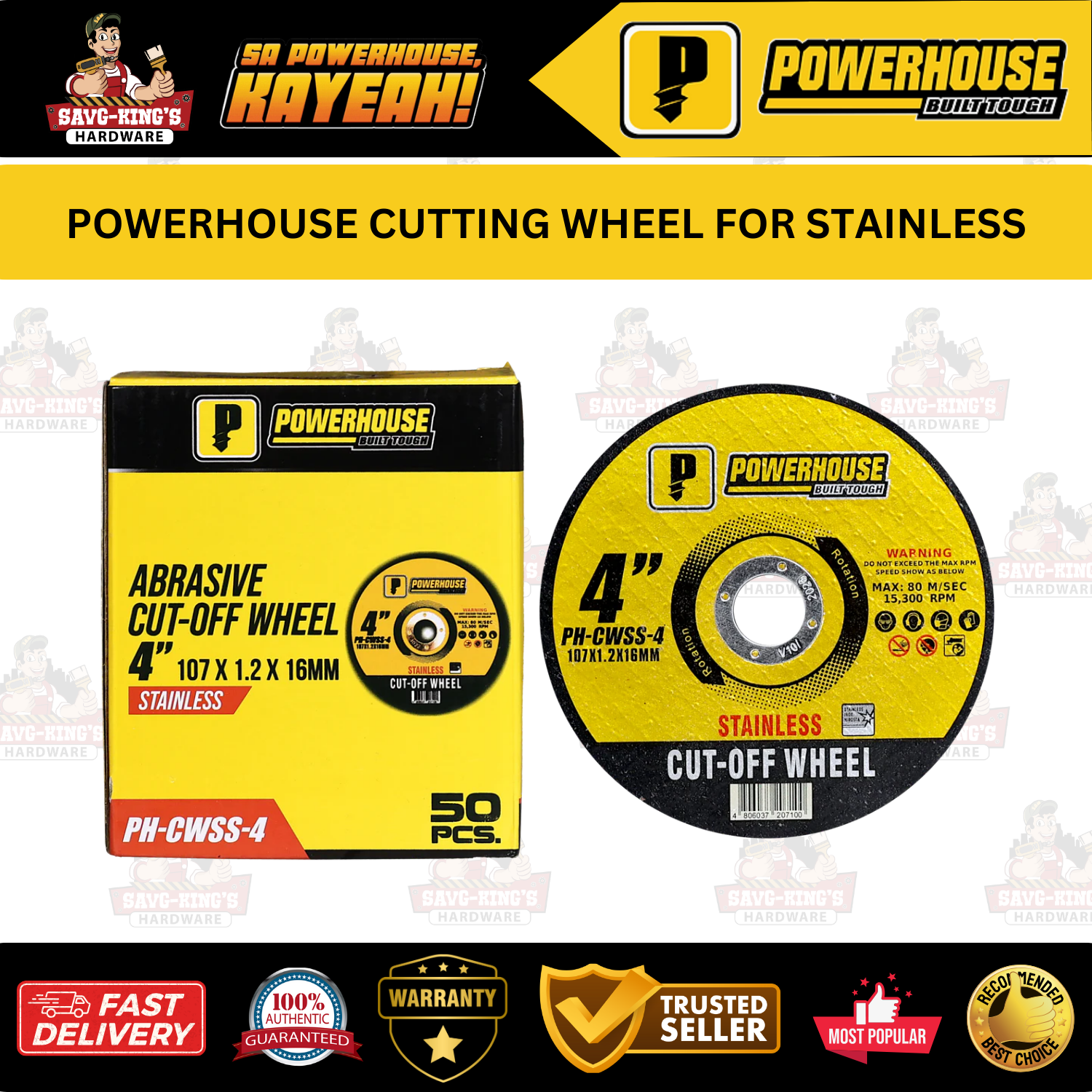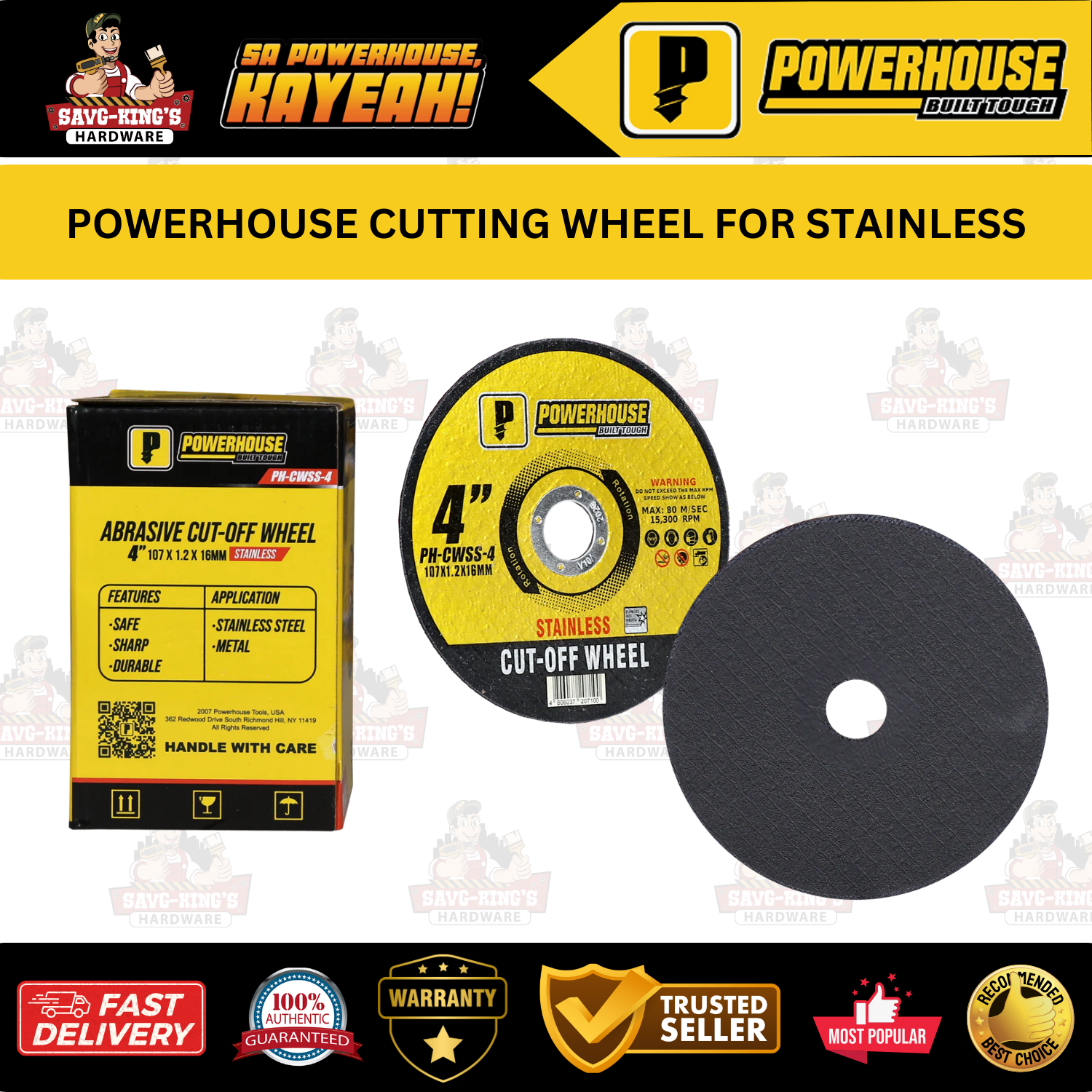 POWERHOUSE Cutting Wheel for Stainless is designed for clean, efficient cuts on stainless steel—available in 4″ (107 x 1.2 x 16mm) size.
