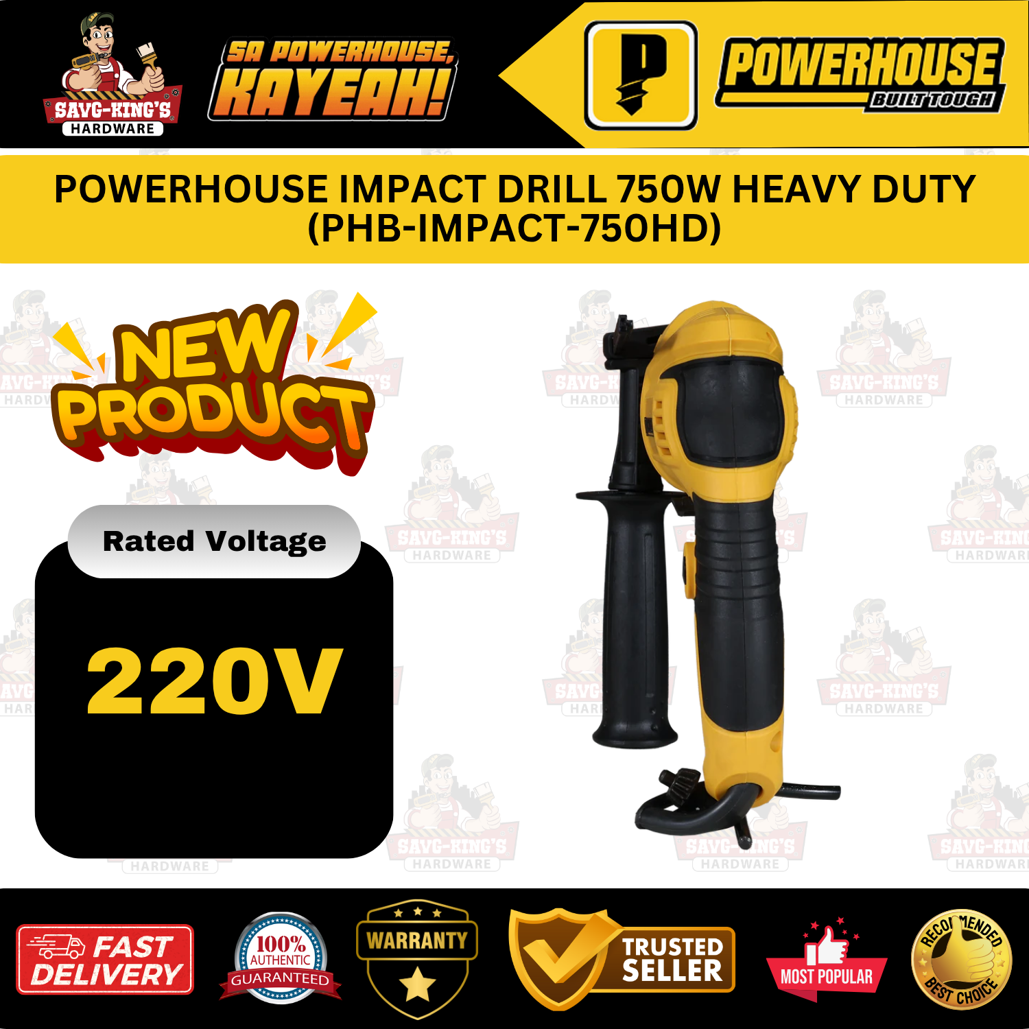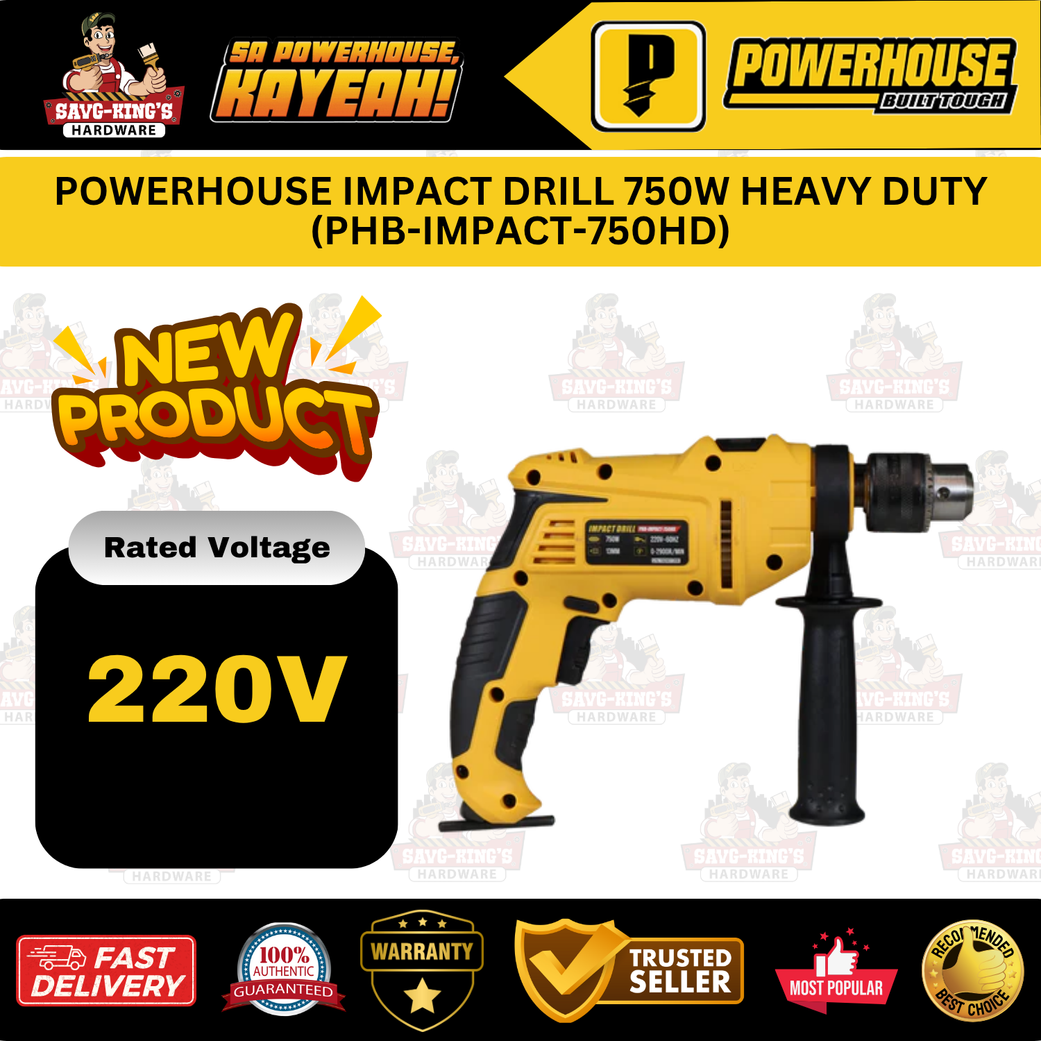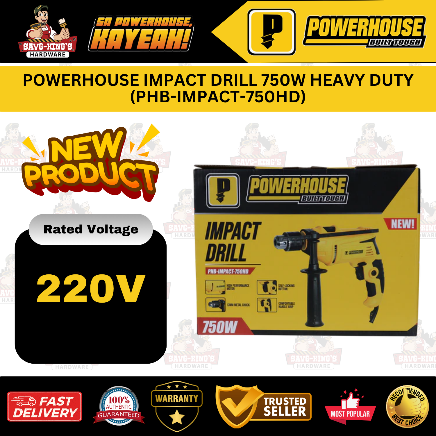 The POWERHOUSE PHB-IMPACT-750HD Impact Drill is built for demanding applications, offering a 750W motor that delivers powerful performance and speed. Its self-locking button enhances user control and safety, while the durable 13mm metal chuck ensures a firm grip for precise and efficient drilling on tough surfaces.