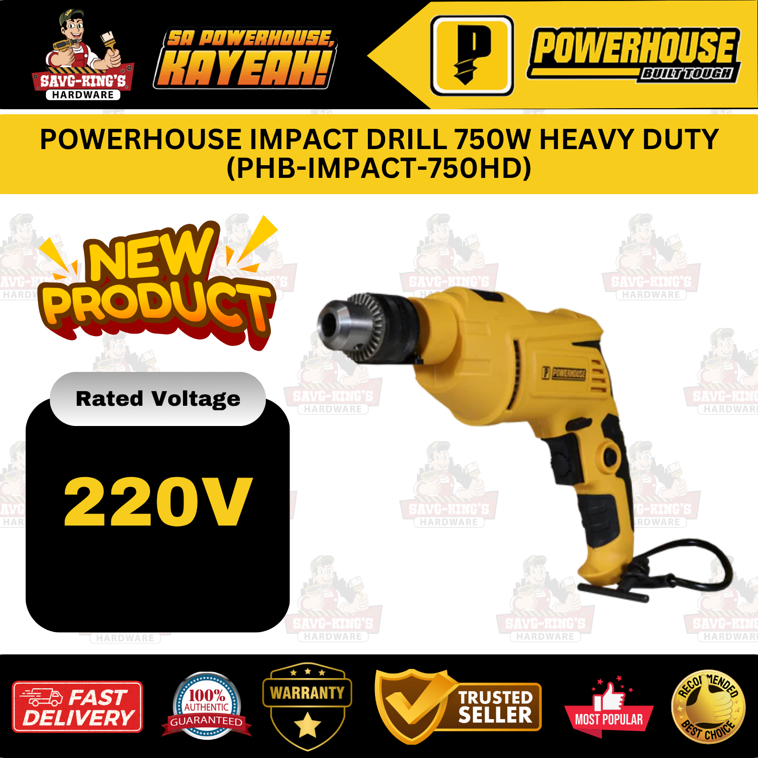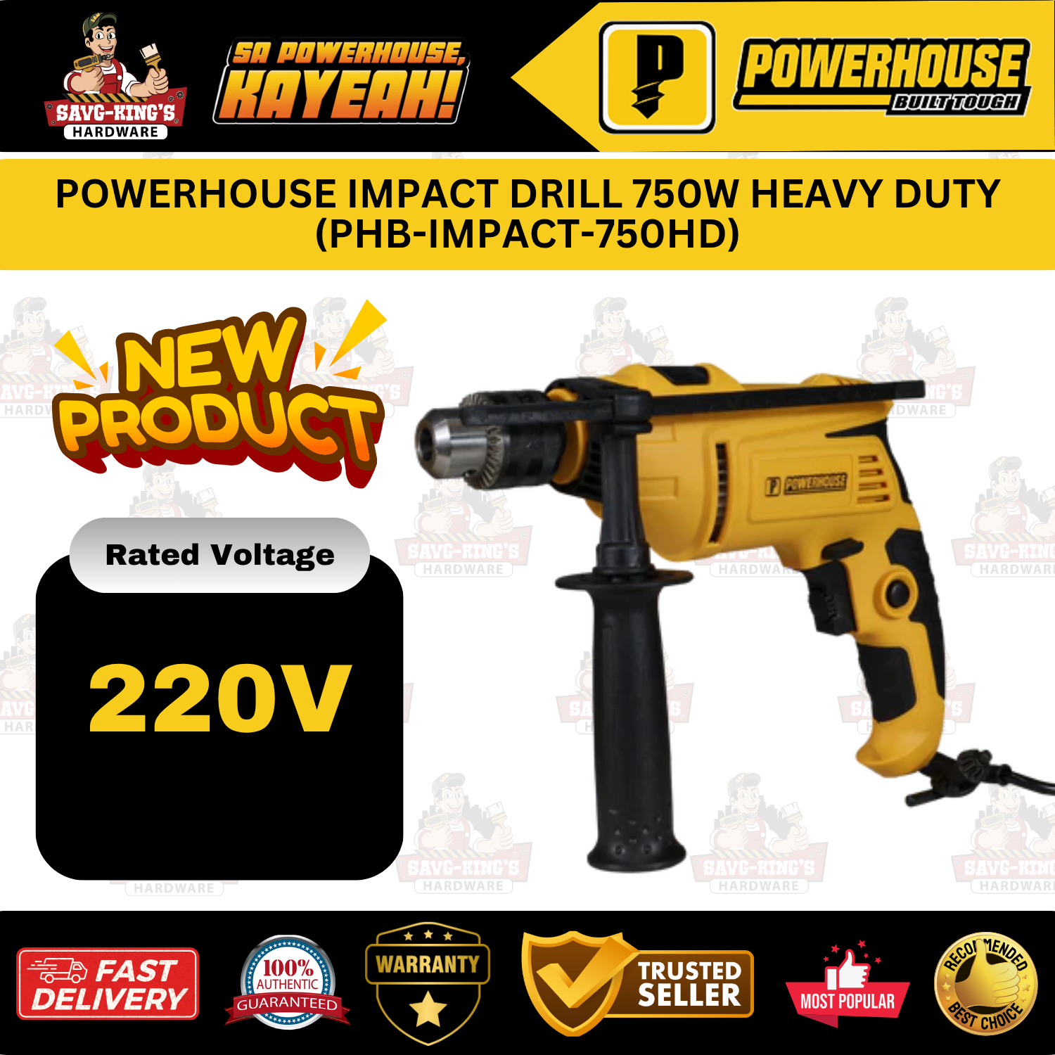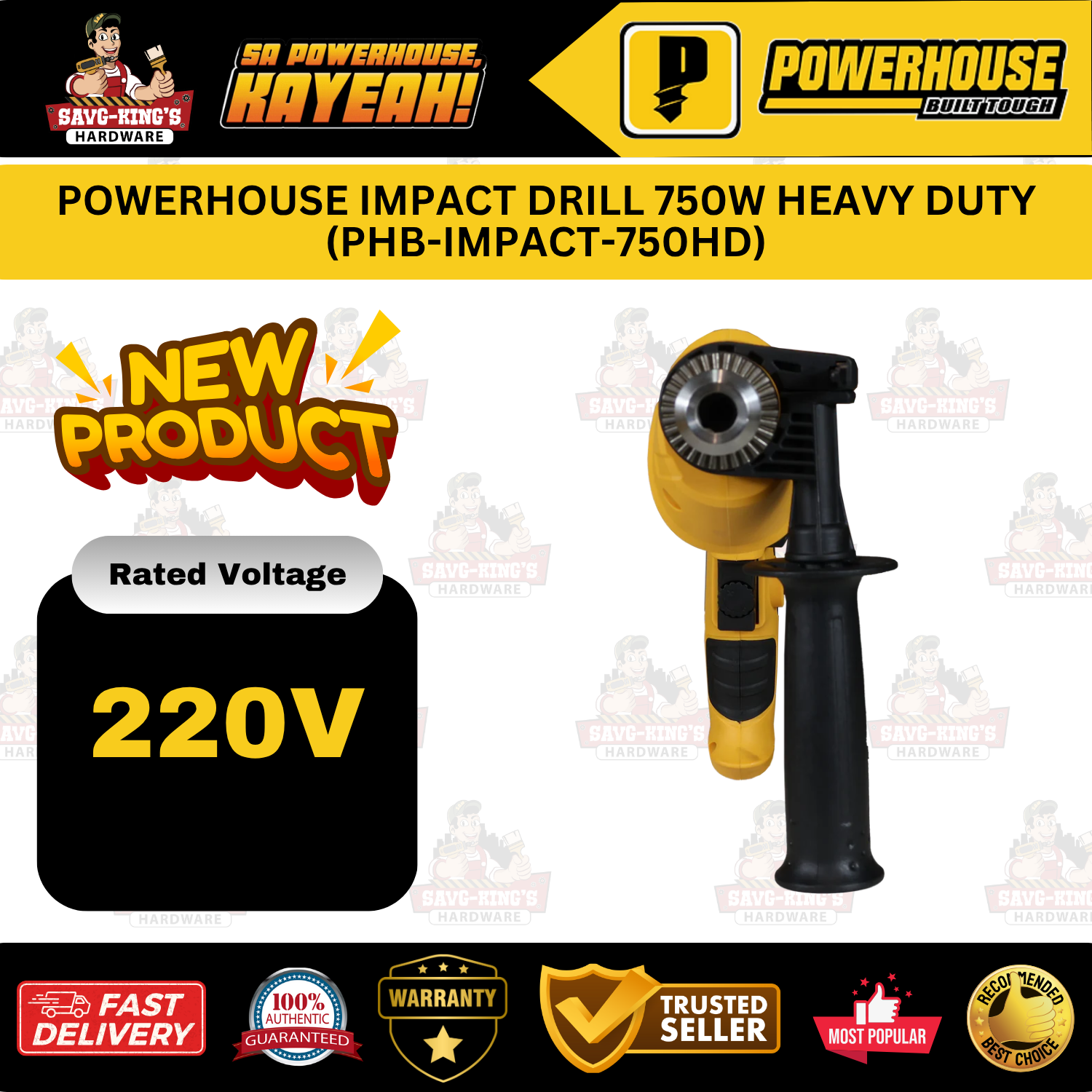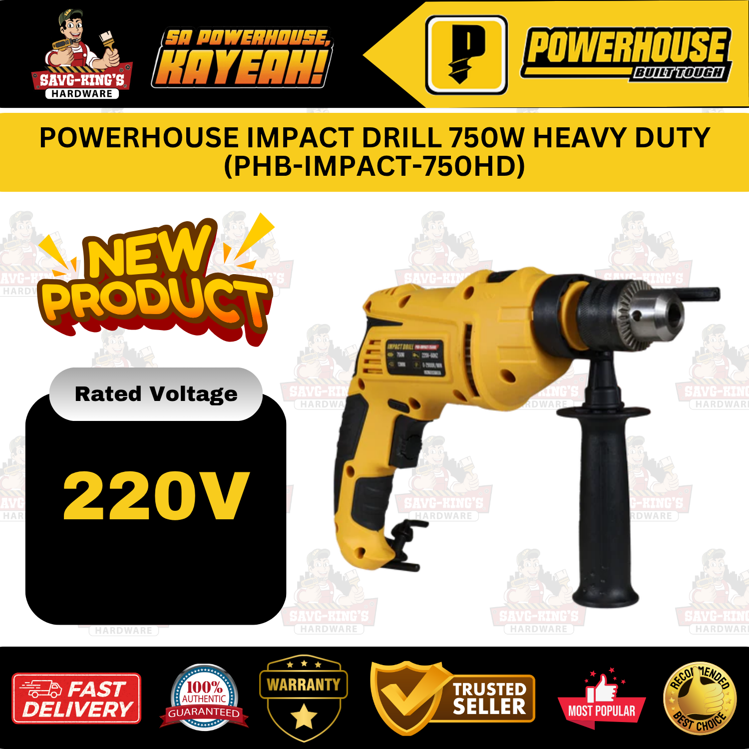 The POWERHOUSE PHB-IMPACT-750HD Impact Drill is built for demanding applications, offering a 750W motor that delivers powerful performance and speed. Its self-locking button enhances user control and safety, while the durable 13mm metal chuck ensures a firm grip for precise and efficient drilling on tough surfaces.