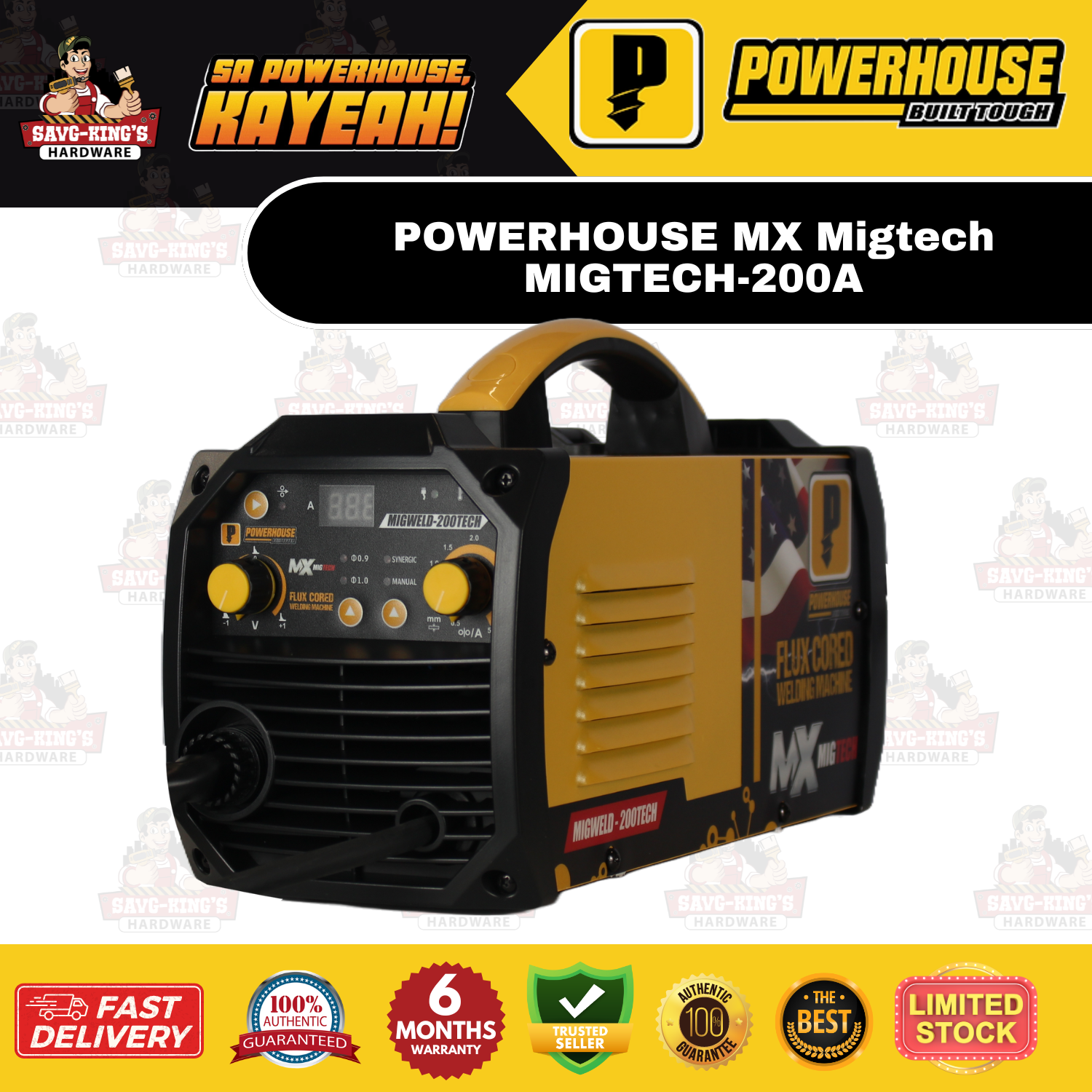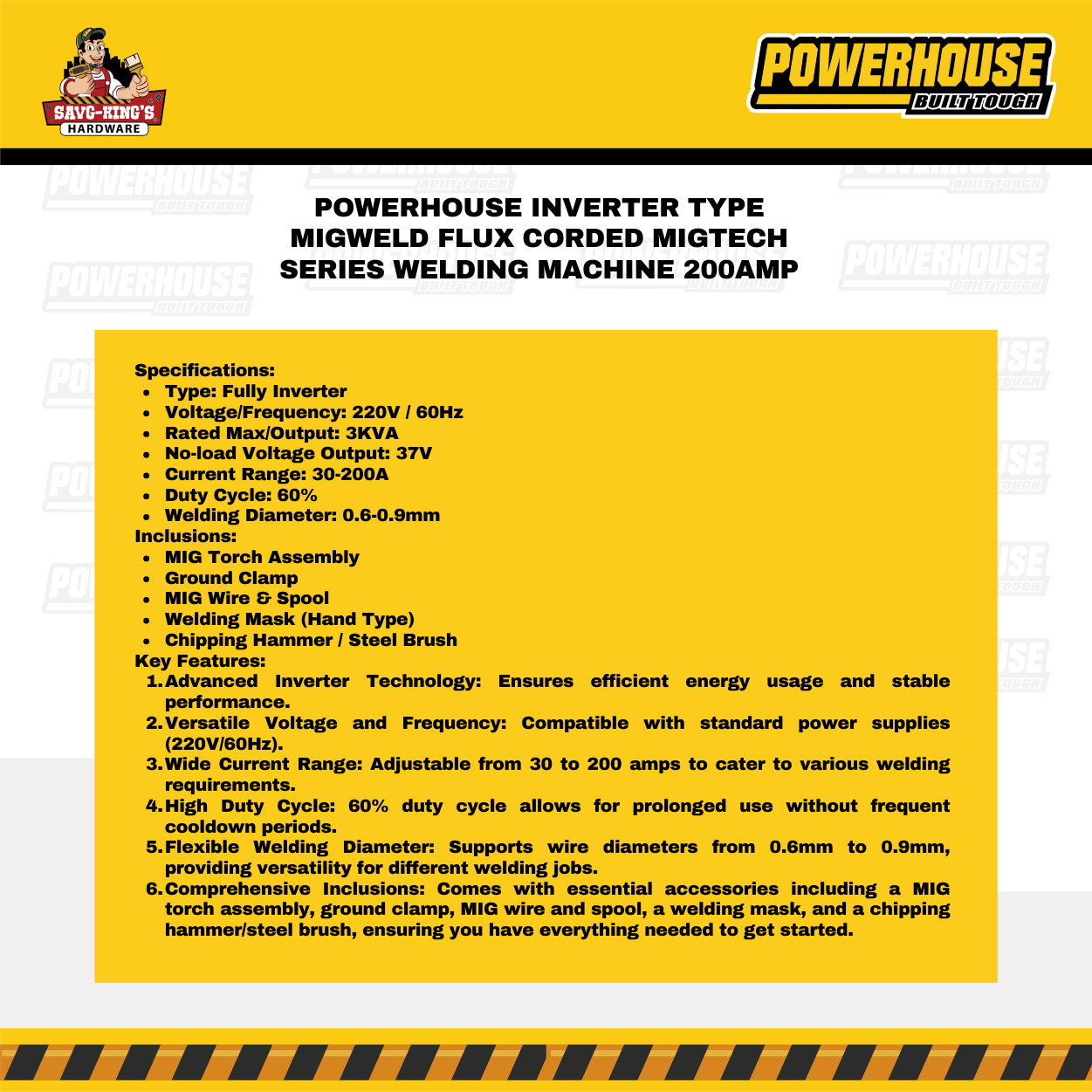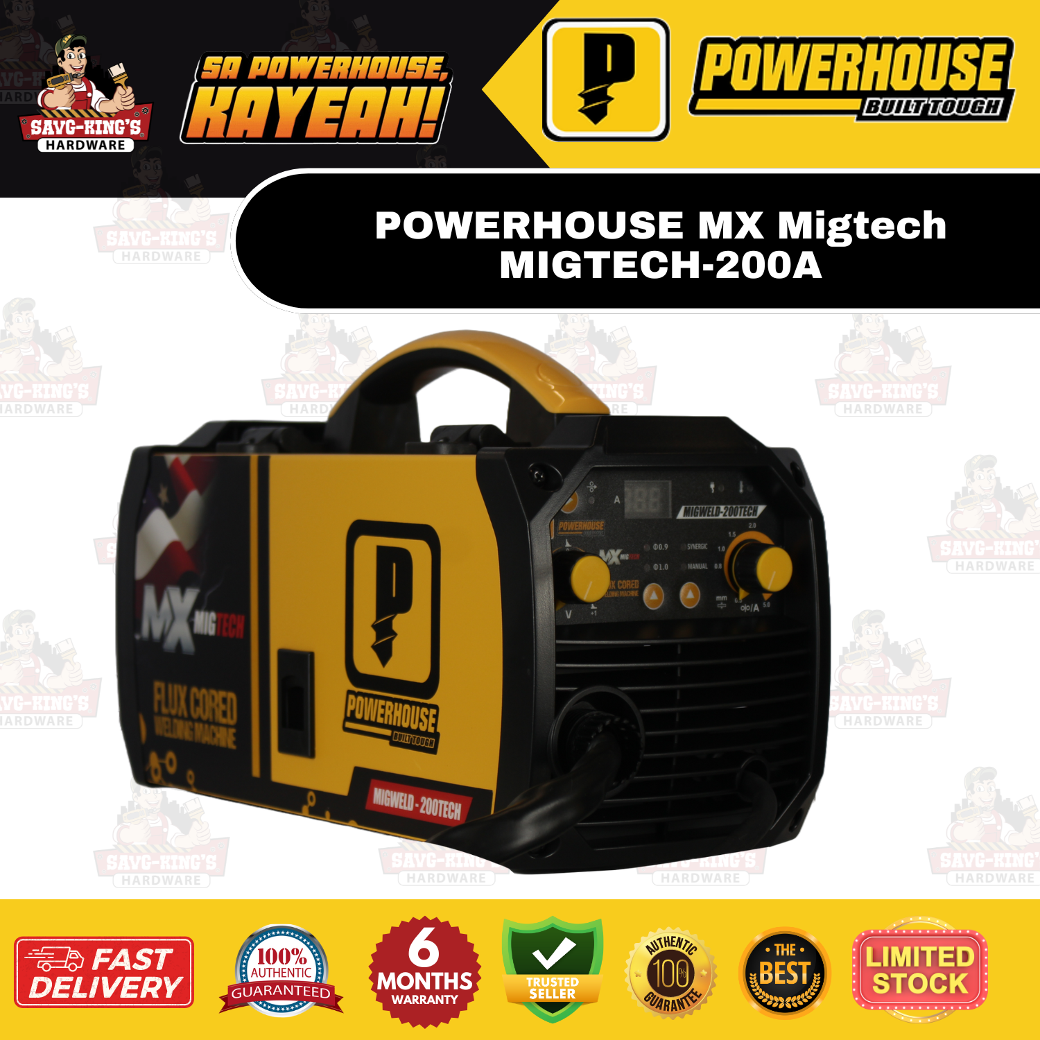 The POWERHOUSE MX Migtech MIGTECH-200 is a compact and efficient inverter welder designed for Stick and MIG welding. It incorporates advanced inverter technology to offer precise and efficient performance, making it suitable for various welding tasks, especially for DIY projects and light industrial use.