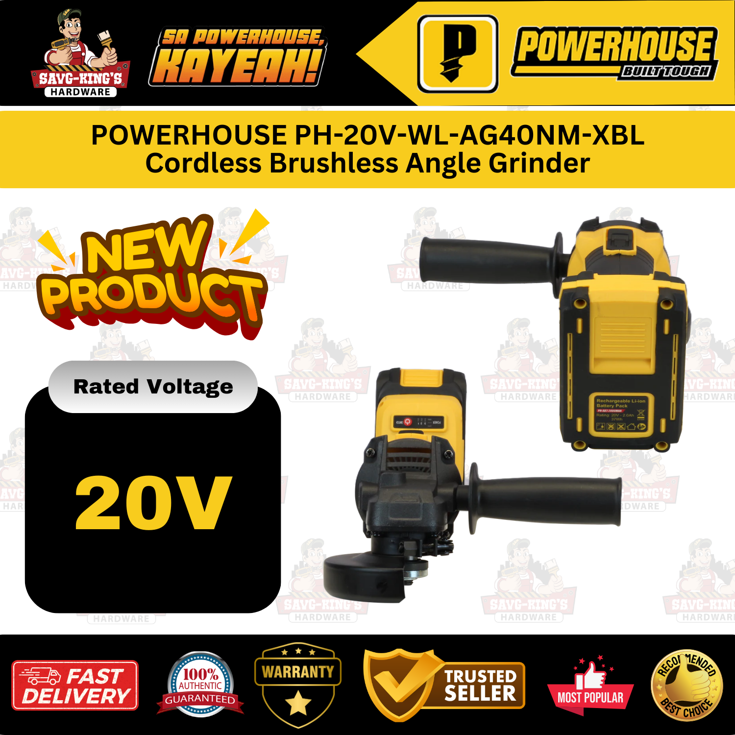 The POWERHOUSE Cordless Angle Grinder PH-20V-WL-AG40NM-XBL is a durable 20V brushless grinder with a 7500RPM motor, built for versatile, cordless performance.